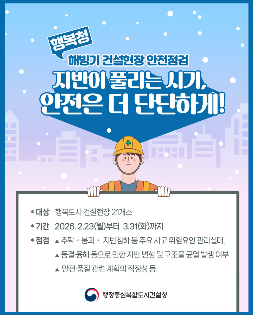 정래화 사업관리총괄과장은 “해빙기에는 작은 이상 징후도 사고로 이어질 수 있는 만큼 위험요인을 사전에 차단하는 데 중점을 두겠다”며 “안전하고 신뢰받는 행복도시 건설을 위해 현장 중심의 관리체계를 더욱 강화해 나가겠다”고 말했다.
