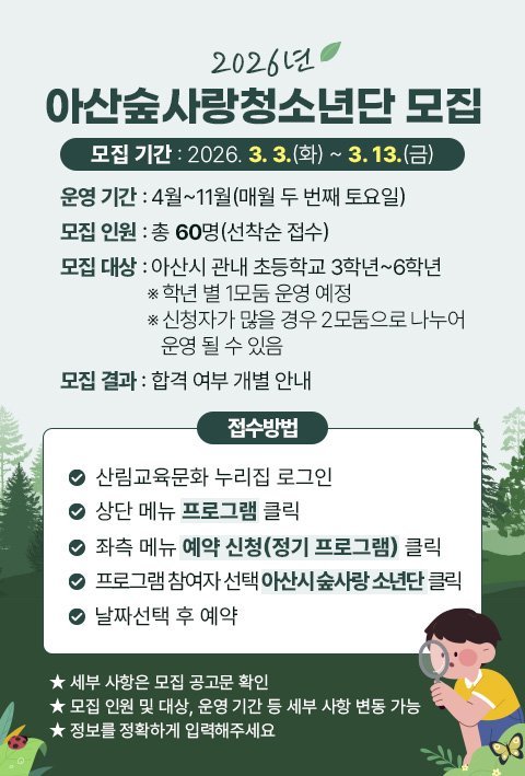[세종타임즈] 아산시는 미래의 숲을 이끌어 갈 차세대 리더로서 성장할 ‘2026년 아산숲사랑청소년단’의 신규 단원을 모집한다.