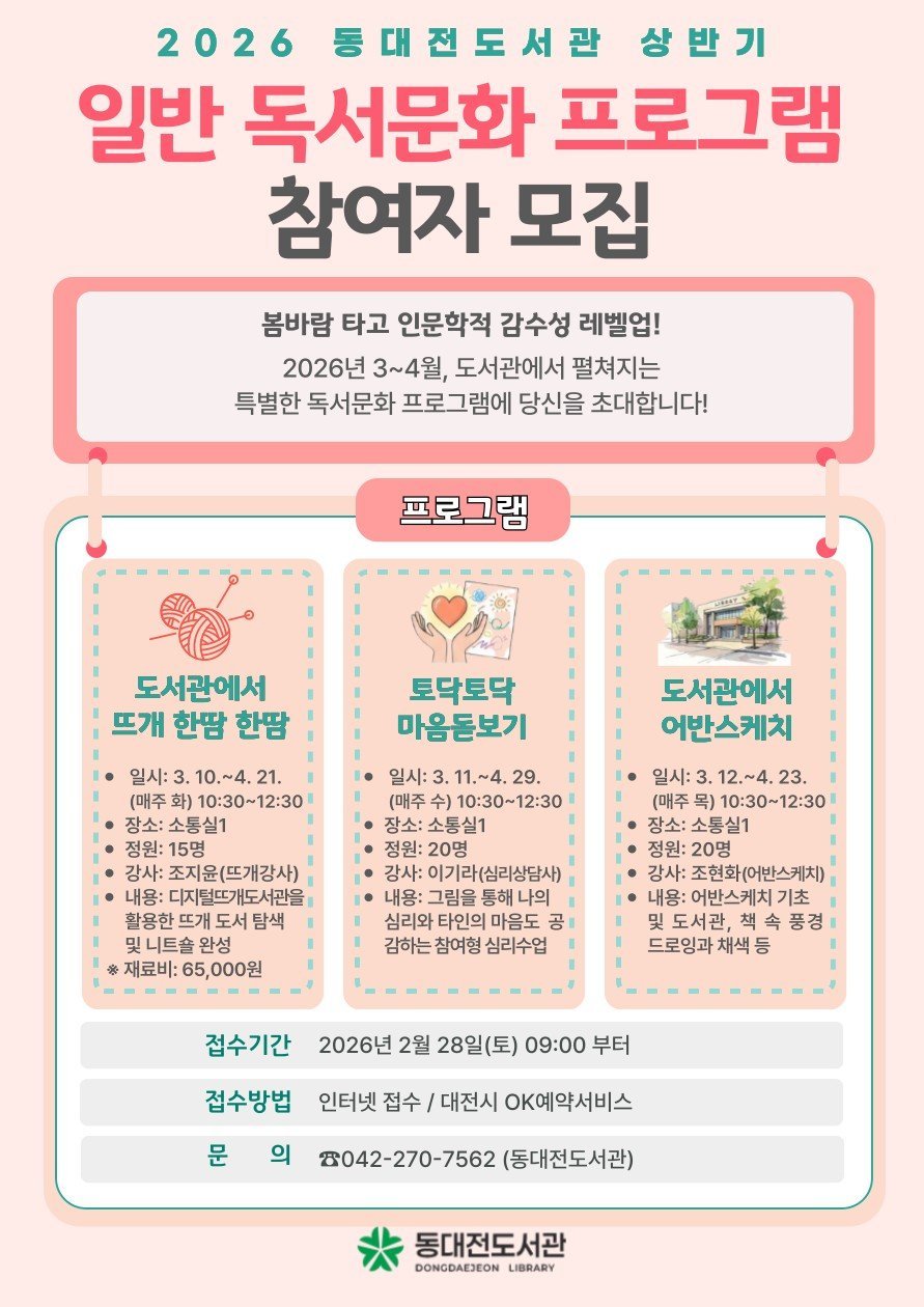 [세종타임즈] 동대전도서관은 새봄을 맞아 3월부터 4월까지 시민들의 문화 향유 기회 확대를 위한 상반기 성인 독서문화 프로그램 을 운영한다.