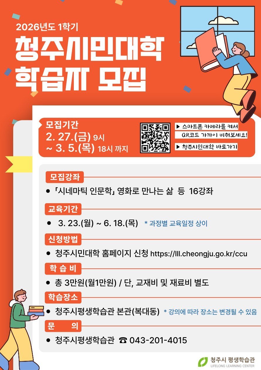 [세종타임즈] 청주시평생학습관은 2026년 1학기 청주시민대학 에 참여할 학습자를 3월 5일까지 모집한다고 27일 밝혔다.