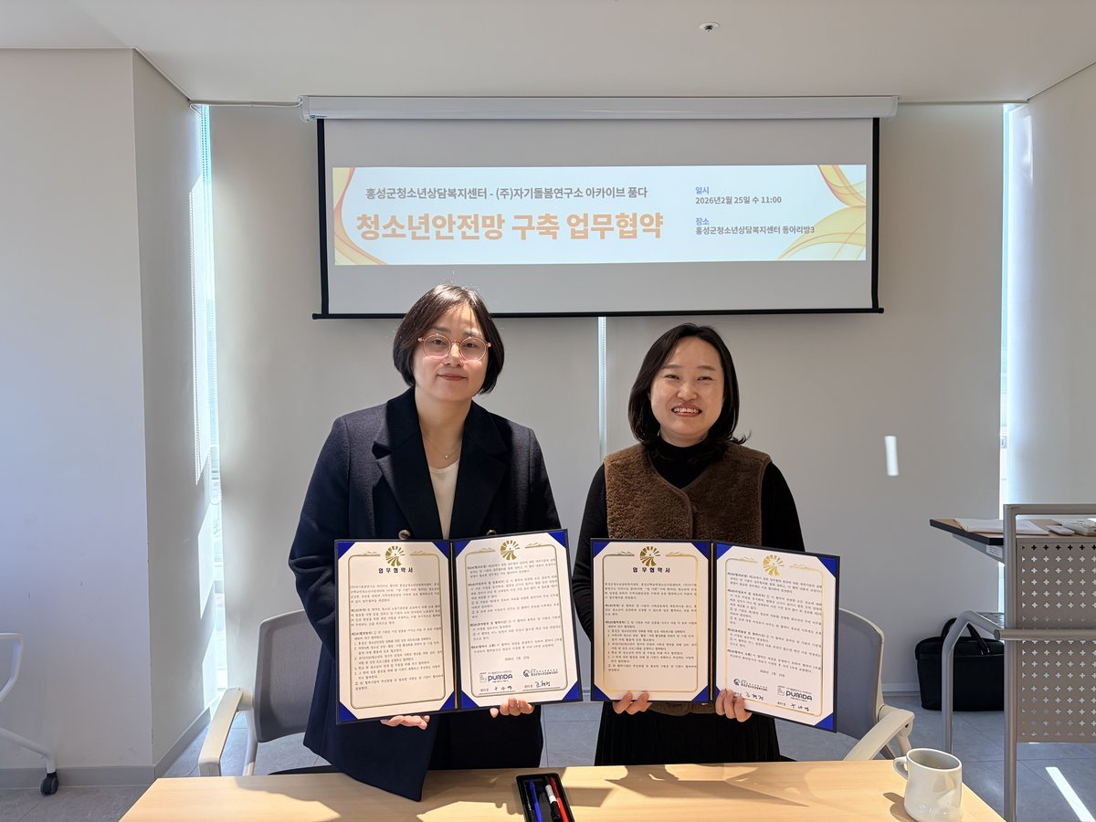 [세종타임즈] 홍성군이 홍성군청소년상담복지센터가 지난 25일 자기돌봄연구소 아카이브 품다와 2026년 청소년안전망 구축을 위한 업무협약 을 체결했다고 밝혔다.