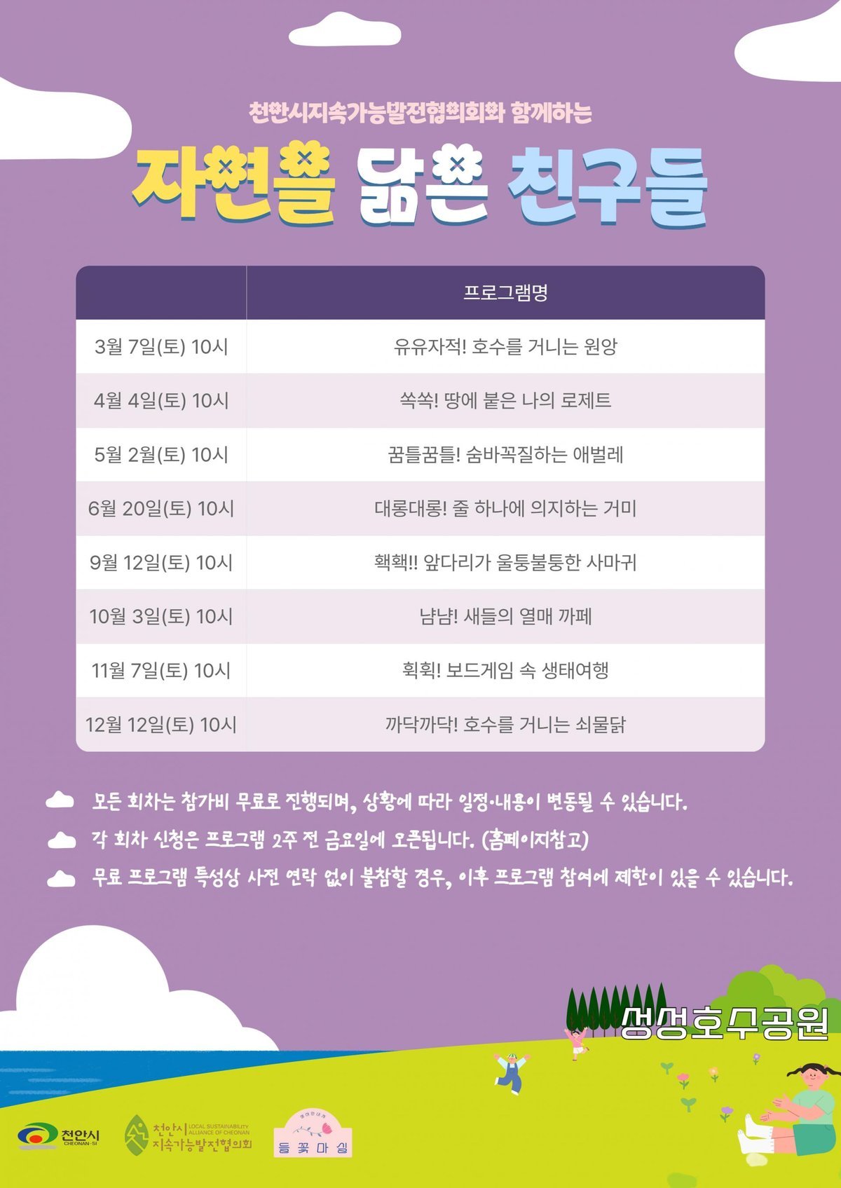 이와 함께 성성호수공원의 동·식물 생태를 관찰하는 자연을 닮은 친구들도 병행 운영한다. 원앙 관찰, 로제트 식물 알기, 애벌레 및 사마귀 관찰 등 도심 속 환경 변화를 쉽게 이해할 수 있는 체험 활동도 추진된다.
