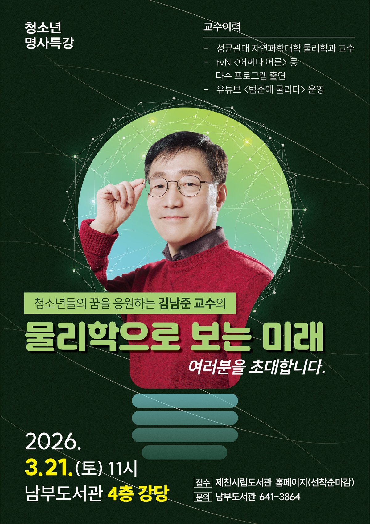 강연은 관내 청소년 및 학부모 약 90명을 대상으로 진행되며 제천시립도서관 누리집에서 3월 3일부터 선착순으로 접수한다.