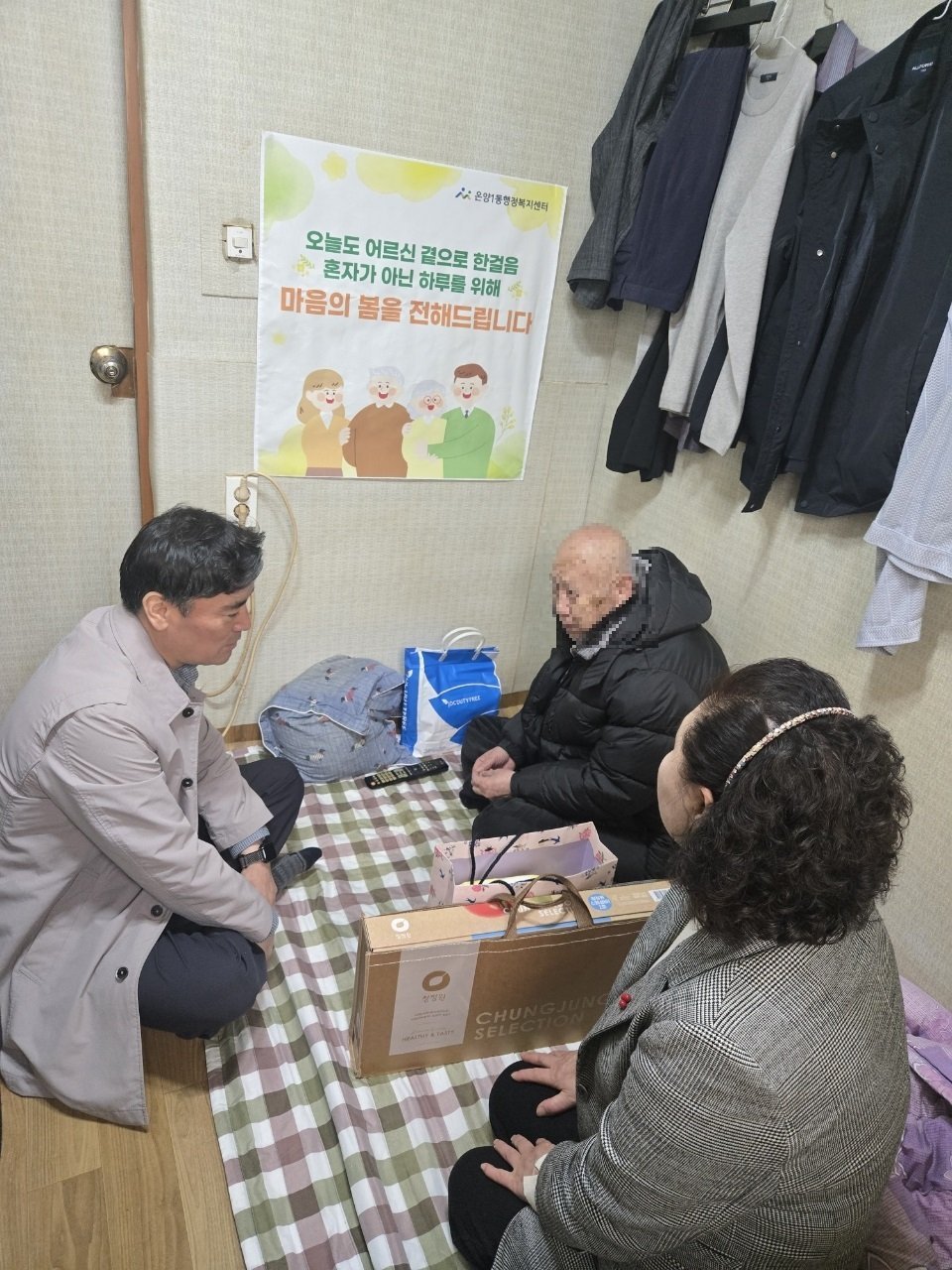 [세종타임즈] 아산시 온양1동 행정복지센터는 25일과 27일 온천1통 온천2통 최고령 독거 어르신을 찾아 안부를 묻고 건강을 살피는 복지통장 특화사업 '마음의 봄을 나누어 드립니다'를 진행했다.