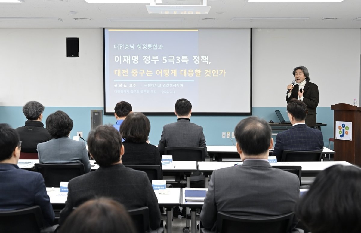 [세종타임즈] 대전 중구는 4일 중구청 다목적대회의실에서 구청장을 비롯한 확대간부회의 참석 대상 간부공무원 68명을 대상으로 ‘정부 5극 3특 정책과 중구의 대응전략’을 주제로 한 심층학습을 실시했다고 밝혔다.