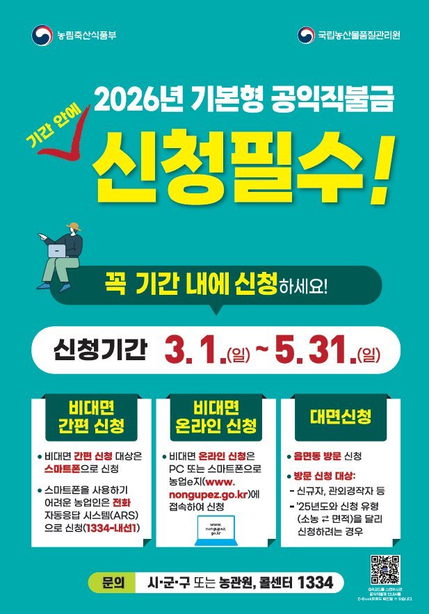 [세종타임즈] 금산군 농업 농촌의 공익기능 증진과 농업인의 소득 안정을 위한 2026년도 기본형 공익직접지불금 등록을 오는 5월 31일까지 접수한다.