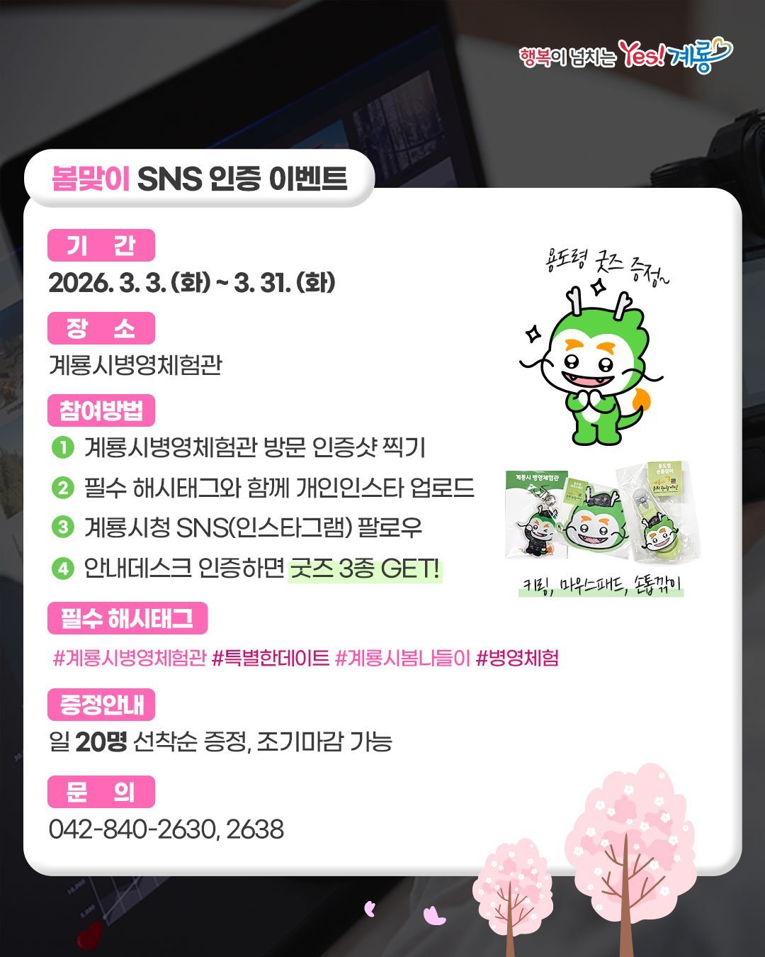 [세종타임즈] 충남 계룡시가 3월 한달 간 계룡병영체험관을 찾는 시민과 관광객을 대상으로 ‘봄맞이 SNS 인증 이벤트’를 진행한다.
