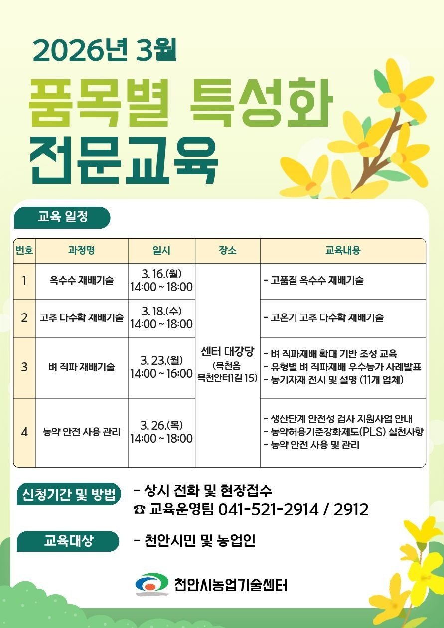 [세종타임즈] 천안시농업기술센터는 본격적인 영농철을 앞두고 ‘품목별 특성화 전문교육’을 운영한다고 6일 밝혔다.
