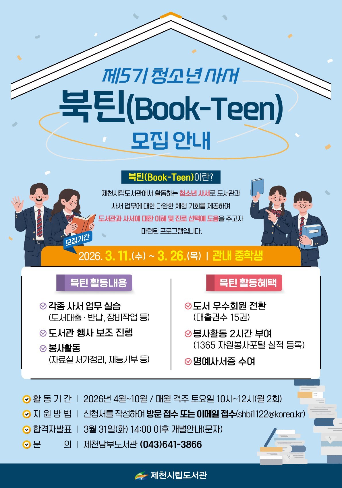 [세종타임즈] 제천시립도서관은 2026년 제5기 청소년 사서 ‘북틴’을 모집한다.