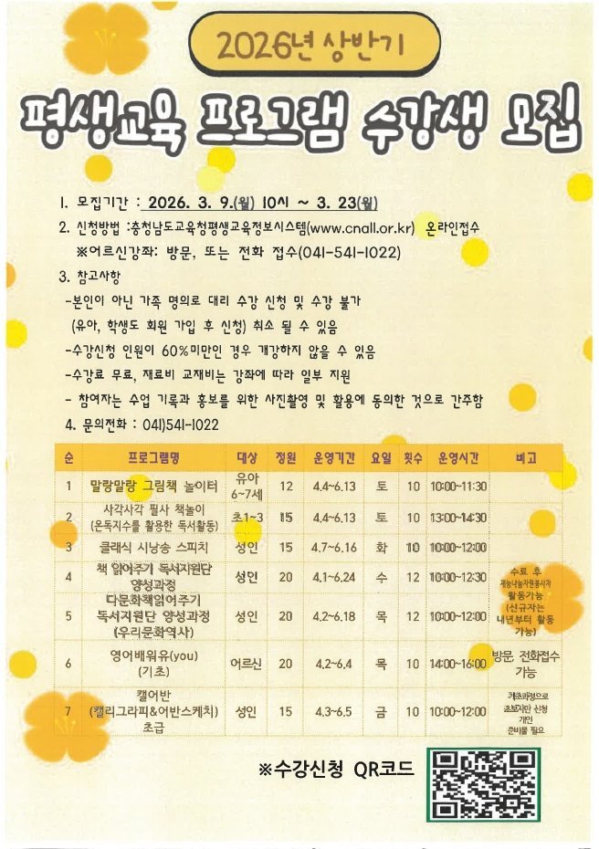 [세종타임즈] 충청남도아산교육지원청아산도서관은 지역 주민의 평생학습 기회를 확대하고 생애주기별 맞춤형 교육을 제공하기 위해 2026년 상반기 평생교육 프로그램 수강생을 모집한다.