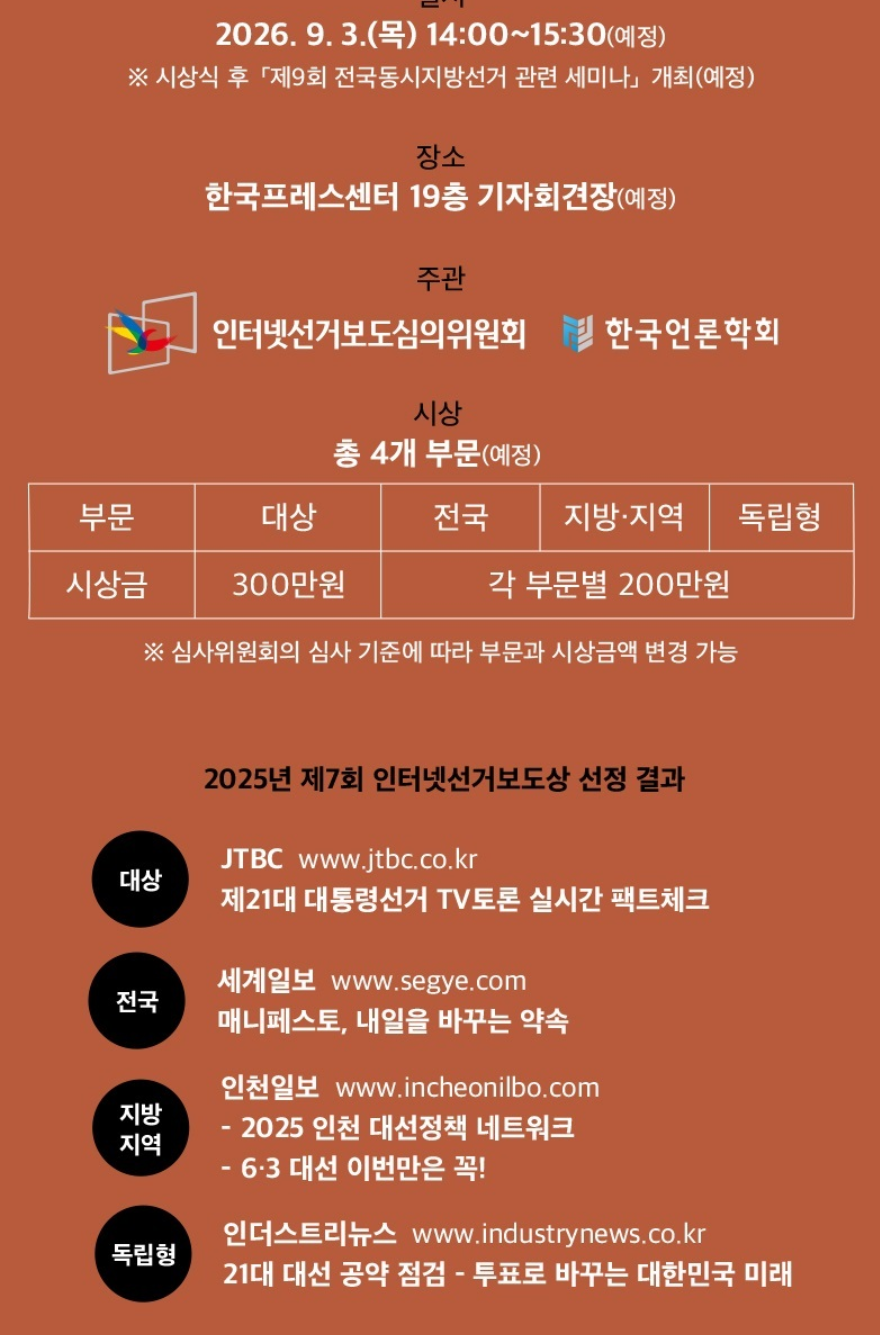 수상 언론사에는 상패와 함께 소정의 상금이 수여되며, 시상식은 2026년 9월 3일(목)에 개최될 예정이다.
