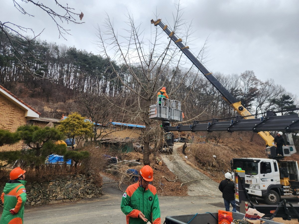 단원들은 오전 일찍부터 안전 교육을 실시한 뒤 크레인 1대, 고소 작업차 1대, 굴삭기 1대 등 중장비를 투입해 약 7시간에 걸쳐 위험목 15주를 제거했다.