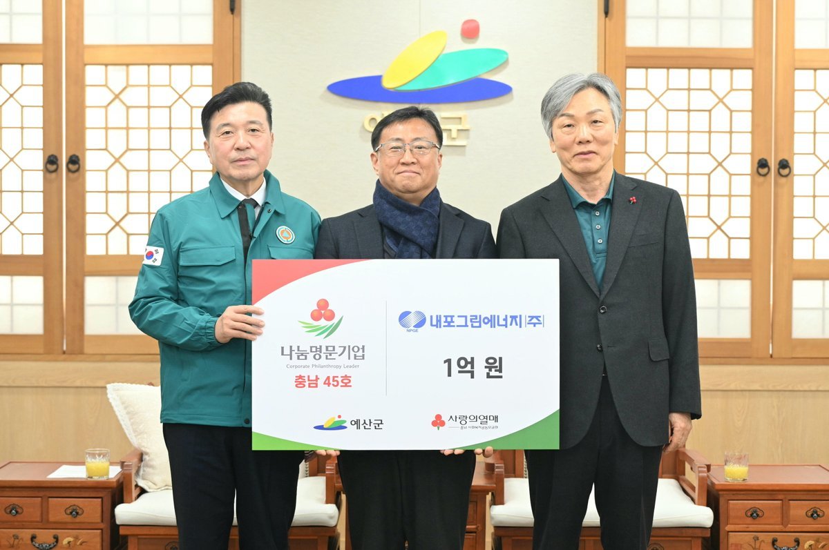 예산군수는 “내포그린에너지 가 나눔명문기업에 가입해 지역사회 공헌에 앞장서 주신 데 깊이 감사드린다”며 “지역 기업이 보여준 선한 영향력이 지역사회를 더욱 따뜻하게 만드는 원동력이 되길 기대한다”고 말했다.