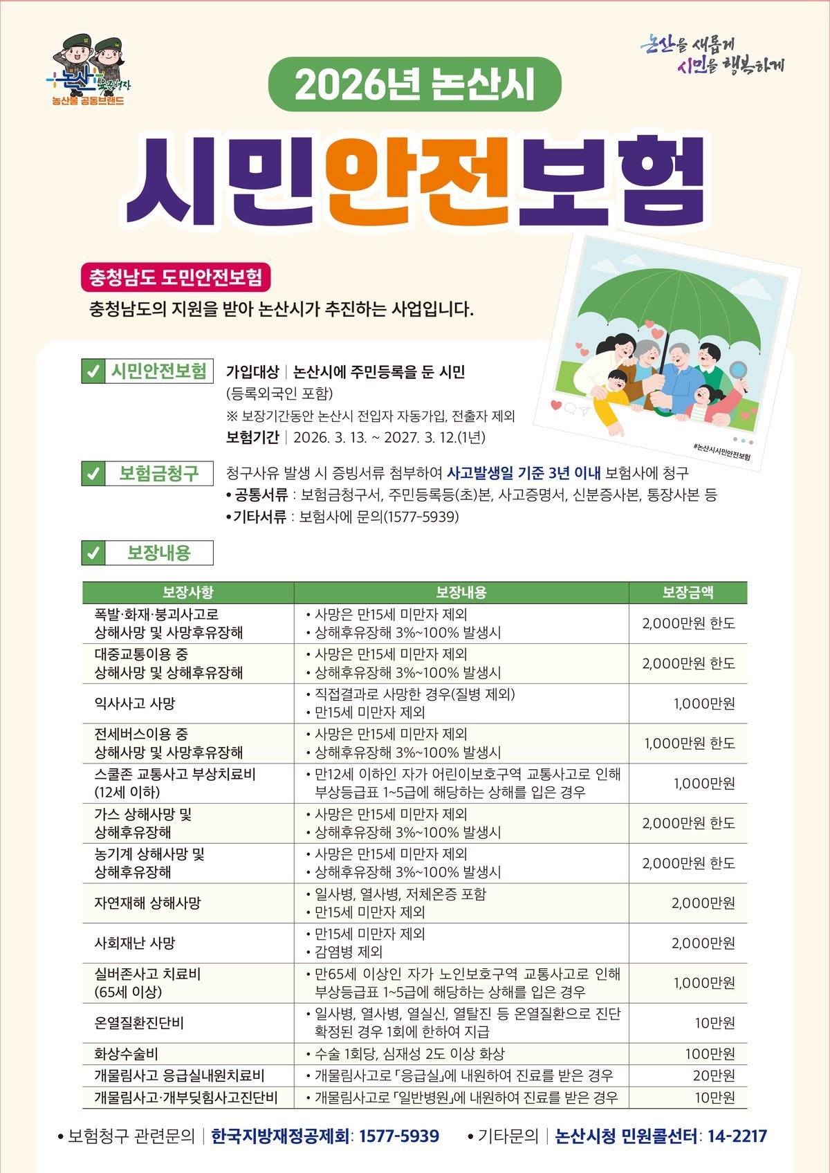 [세종타임즈] 논산시는 시민들이 일상생활 중 발생할 수 있는 각종 재난과 안전사고에 대비하기 위해 시민 안전 보험을 운영하고 있다.