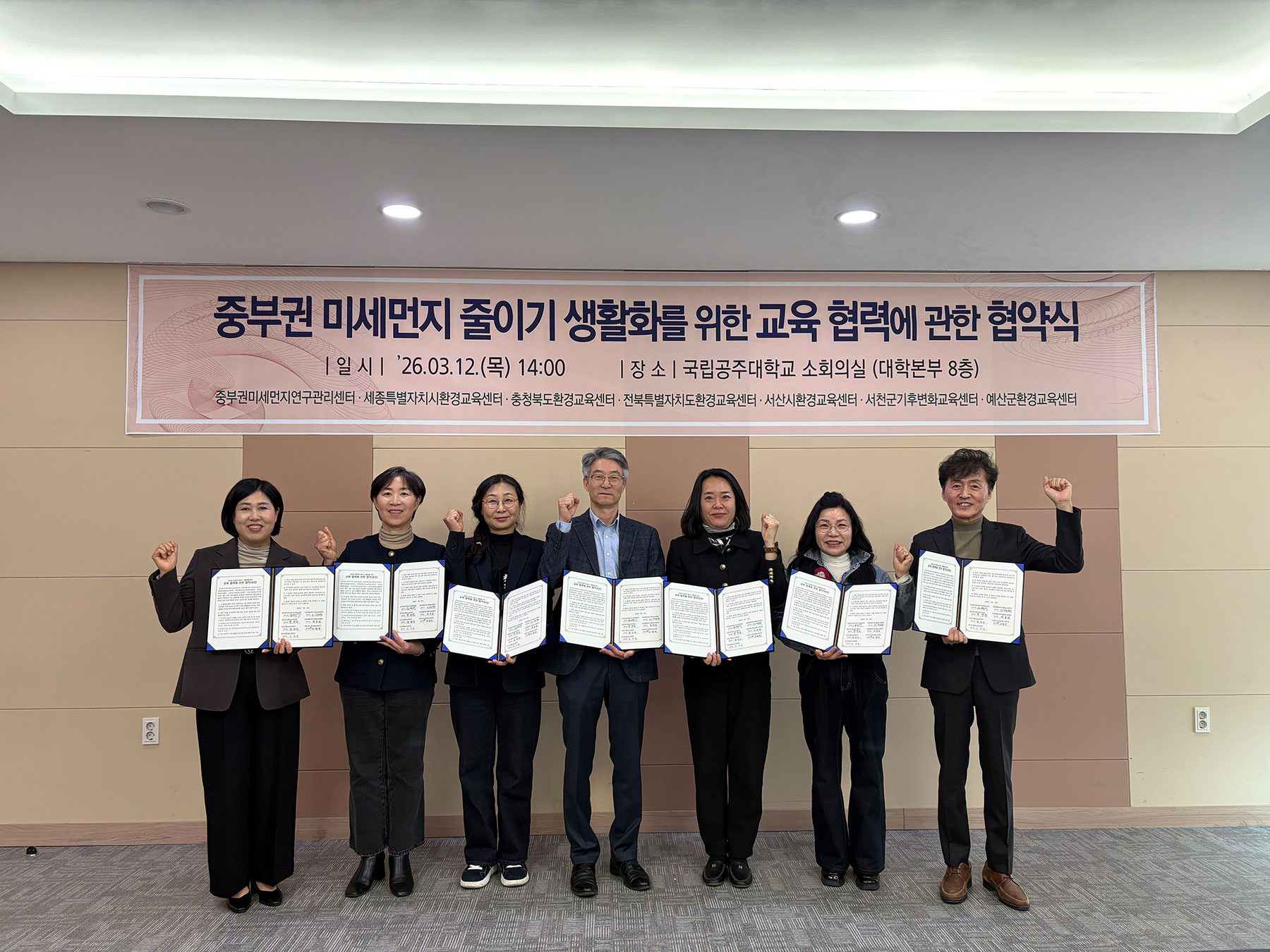 국립공주대는 12일 대학본부 8층 소회의실에서 중부권미세먼지연구관리센터와 중부권 환경교육기관들이 ‘미세먼지 저감 생활화 교육 확산’을 위한 협력 체계를 구축하기로 했다고 밝혔다. 이번 협약은 지역 맞춤형 환경교육을 통해 미세먼지 저감에 기여하고, 환경교육 사업의 유기적 협력체계를 강화하기 위해 마련됐다.