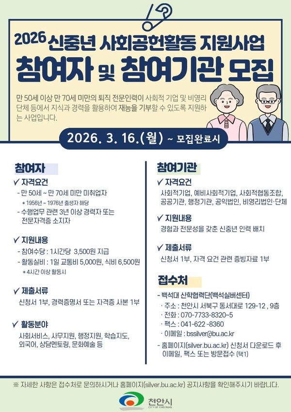 [세종타임즈] 천안시가 퇴직 전문인력의 풍부한 경험을 지역사회 공헌 활동으로 연결하는 ‘2026 신중년 사회공헌활동 지원사업’을 추진한다.