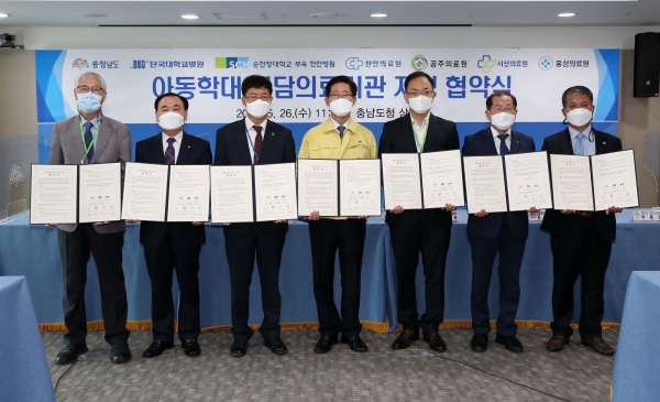 양승조 충남지사는 26일 도청에서 단국대학교의과대학부속병원, 순천향대학교부속 천안병원, 천안·공주·서산·홍성의료원과 ‘아동학대 전담의료기관 지정 협약’을 체결했다.