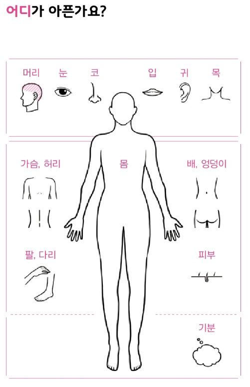 그림 문진표 개발은 대웅제약과 피치마켓에서 공동으로 제작한 ‘참지마요 프로젝트–몸이 아파요’의 삽화를 토대로 응급환자별 주요 증상과 병력은 물론 각 신체 부위를 나누어 체계적으로 환자를 평가할 수 있는 시스템이다.