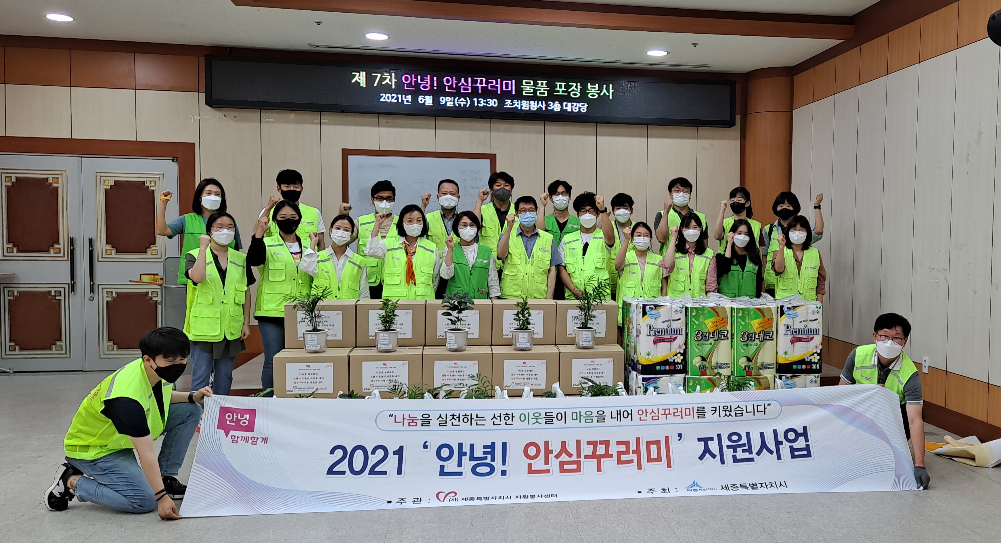 이번 안심꾸러미에는 ▲㈜삼성전기 세종사업장 식물화분 ▲한국영상대학교 핸드크림 ▲세종시 시설관리공단 구운계란 ▲공무원연금공단 세종지부 커피믹스 ▲세종시어린이집연합회 햇반 ▲(주)오송팜 우리햄 ▲네오로지스 두유 ▲조치원로타리클럽 라면 ▲국민건강보험 세종지사 마스크 ▲㈜리봄화장품 화장품 ▲㈜행복S&P제지 30롤화장지 ▲세종마스터힐스 입주예정자협회 수건 ▲대한노인회 세종시지회 수세미 ▲세종시자원봉사센터 전문봉사단 밑반찬(깍두기, 열무김치) ▲자장면봉사단 자장소스 ▲지도자아카데미단장 조미김 ▲청춘봉사단총무 치약 ▲천사랑봉사단 인견 반바지 ▲자원봉사플랫폼 은빛지킴이 예쁜 손편지를 후원했다.