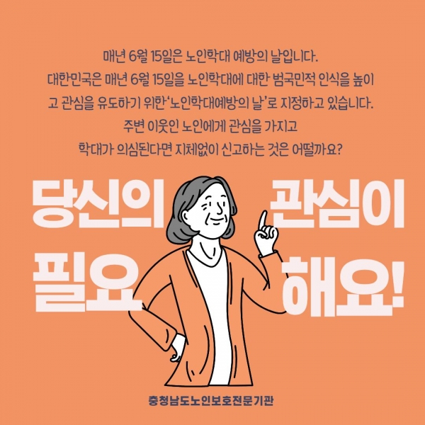 [세종타임즈] 충남도는 오는 15일 ‘제5회 노인학대예방의 날’을 맞아 도내 노인보호전문기관 2개소와 온·오프라인 홍보캠페인을 전개한다고 밝혔다.