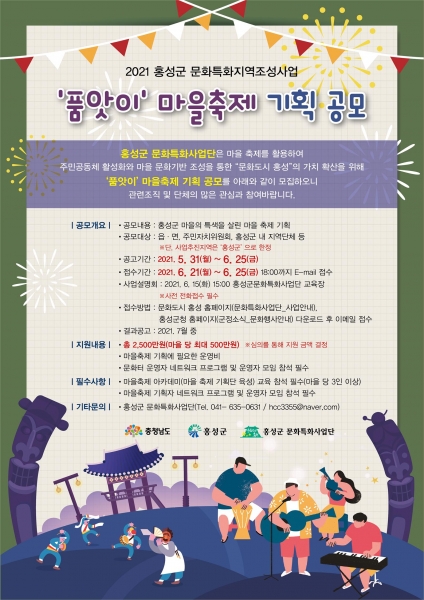 서계원 문화관광과장은 “이번 공모는 마을의 문화자산을 바탕으로 마을 공동체를 활성화하고 군민이 즐길 수 있는 다양한 문화적 체험 기회를 제공할 것”이라며 “문화도시 홍성을 위해 주민주도의 마을축제의 장을 조성해 나가겠다”고 강조했다.