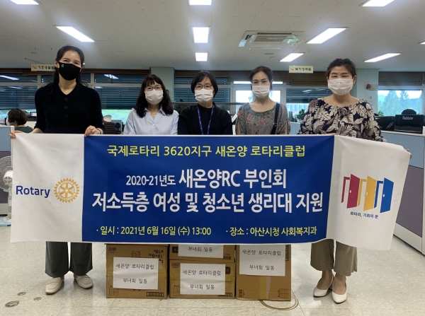 이번 후원은 복지사각지대에 있는 아산시 여성청소년들이 매월 일주일가량 많은 어려움이 처해있다는 사실을 전해 들은 새온양로타리클럽 부녀회가 아산시 통합사례관리 대상자에게 여성용품을 지원하기로 결정하면서 진행됐다.