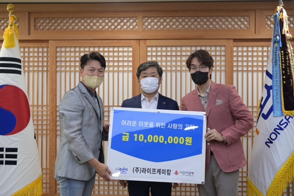 황명선 논산시장은 “코로나19로 어려운 시기에 따뜻한 정을 나눠주신 ㈜라이프케미칼에 진심으로 감사드린다”며 “이번 기탁이 우리 주변의 어려운 이웃과 논산의 미래인 청년들에게 큰 힘이 될 수 있을 것”이라고 전했다.