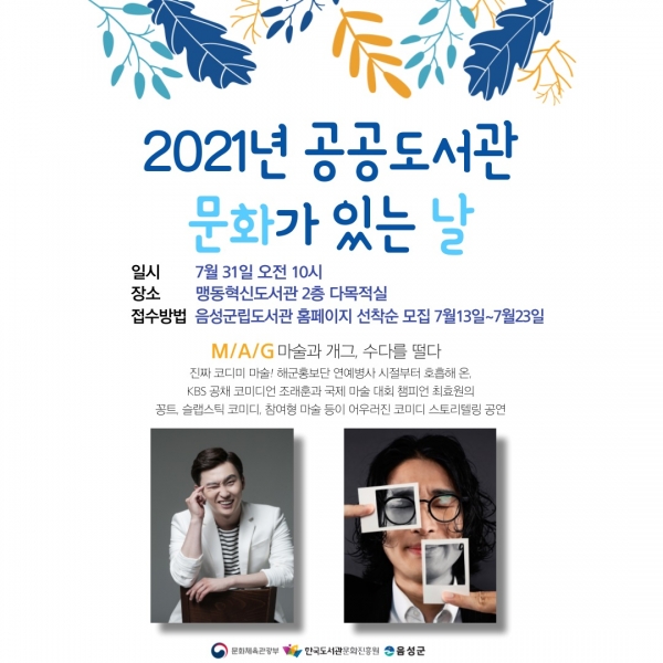 [세종타임즈] 충북 음성군은 오는 31일 맹동혁신도서관에서 ‘공공도서관 문화가 있는 날’을 맞아 ‘마술과 개그, 수다를 떨다’ 공연을 개최한다.